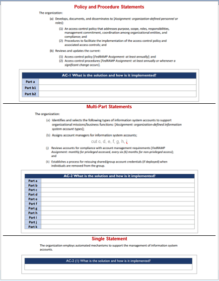 For each of the -1 controls, such as AC-1, there must be exactly five statement assemblies: Part (a)(1), Part (a)(2), Part (b), Part (c)(1), and Part (c)(2).